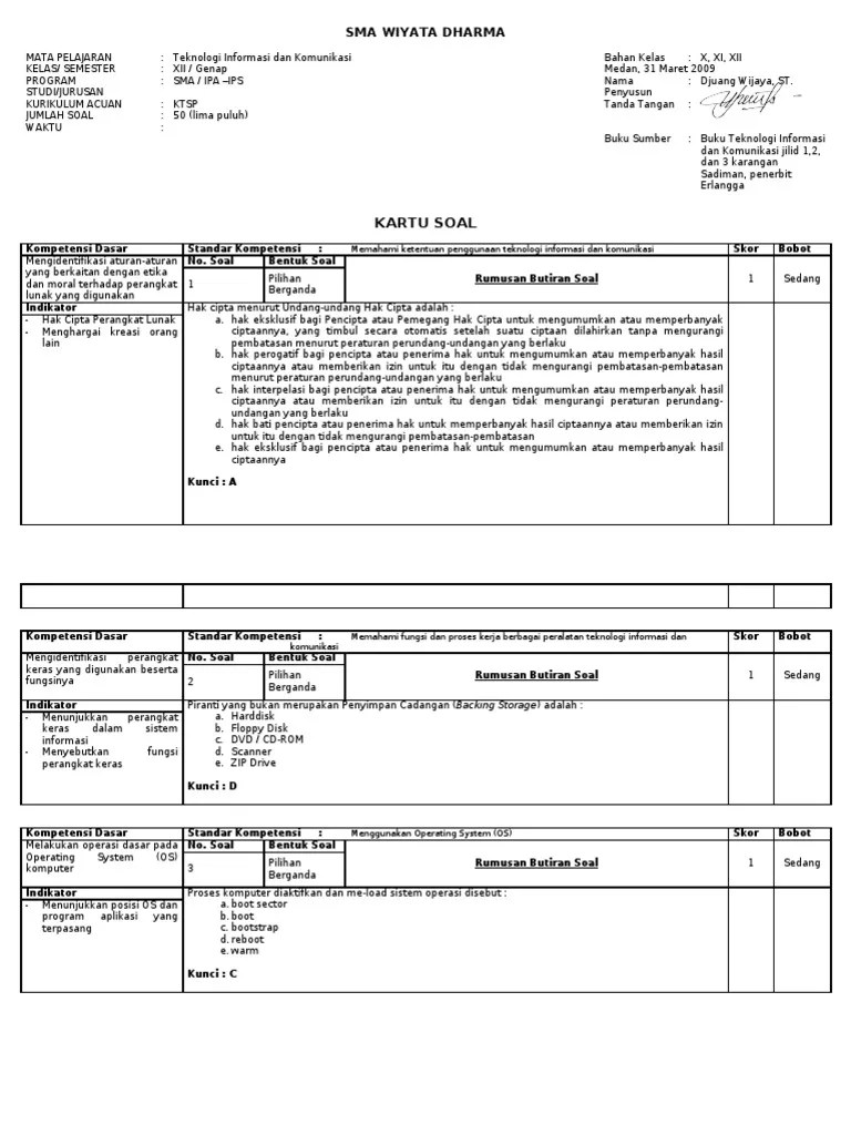 Kartu soal bentuk pg jenis sekolah : Kartu soal pilihan ganda tik. Kumpulan soal ini dikutip dari buku kumpulan soal tes tik sma karya . Teknologi informasi dan komunikasi jenis sekolah : Sma tunas baru pangkalan berandan ulangan .